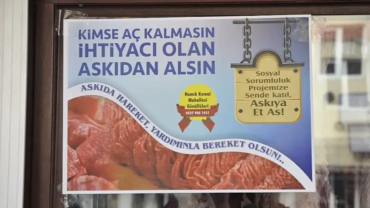 İhtiyaç sahipleri için uygulamamızı destekleyen esnaflarımız dükkanların camlarına askıda et ve ekmeğin bulunduğunu belirten afişleri astı. Biz de vesile olduğumuz için çok mutluyuz diyen Okur, ’’Mahallemizin değerli sakinleri ve esnaf kardeşlerimize de çok teşekkür ediyorum. Her şey Namık Kemal için’’ diye konuştu.