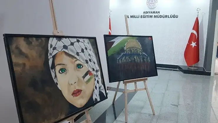 Adıyaman´da lise öğrencileri tarafından yapılan Filistin temalı yağlı boya eserler Milli Eğitim Müdürlüğü koridorlarında sergilendi.