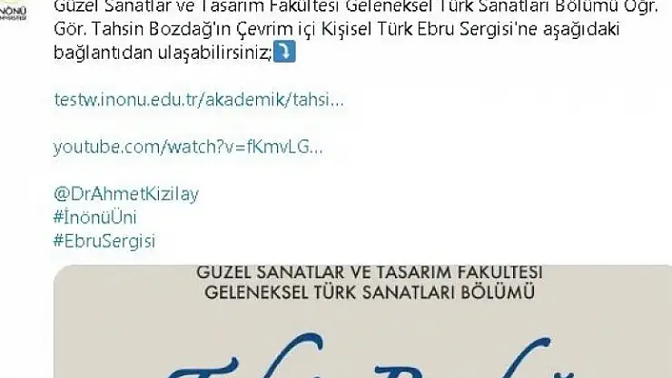 İnönü Üniversitesi tarafından yapılan açıklamada, "Güzel Sanatlar ve Tasarım Fakültesi Geleneksel Türk Sanatları Bölümü Öğretim Görevlisi Tahsin Bozdağ´ın Çevrim içi Kişisel Türk Ebru Sergisi´ne Youtube bağlantıdan ulaşabilirsiniz" denildi.