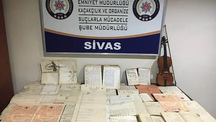 Sivas İl Emniyet Müdürlüğü Kaçakçılık ve Organize Suçlarla Mücadele Şube Müdürlüğü ekipleri tarihi eser kaçakçılığıyla mücadele çalışmaları kapsamında Ö.Y.Y. isimli şahsın evine operasyon düzenledi. Evde yapılan aramada Osmanlı İmparatorluğu dönemine ait el yazması Kur’an-ı Kerim ve tıp ilmiyle ilgili toplam 824 sayfa 7 adet el yazması kitap, yine Osmanlı dönemine ait 8 adet noter evrakı, 6 adet kadılık zaptı, 5 adet zabıt tutanağı, 5 adet tapu, 3 adet senet, 1 adet sicil kağıdı, 1 adet el yazması dua olmak üzere 29 adet parça halinde el yazması eser ve 1 adet müzik enstrümanı olan antika keman ele geçirildi.