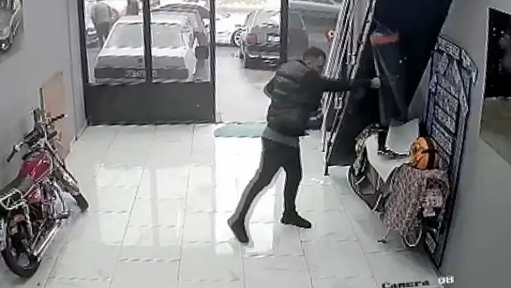 Galerici Uğur Gönül, hızını alamayarak boks torbasına yaklaşık 15-16 yumruk salladı. Darbelere dayanamayan boks torbası bir anda patlarken, parçaları ise etrafa saçıldı. Bu anlar ise iş yerinin güvenlik kamerasınca saniye saniye kaydedildi.