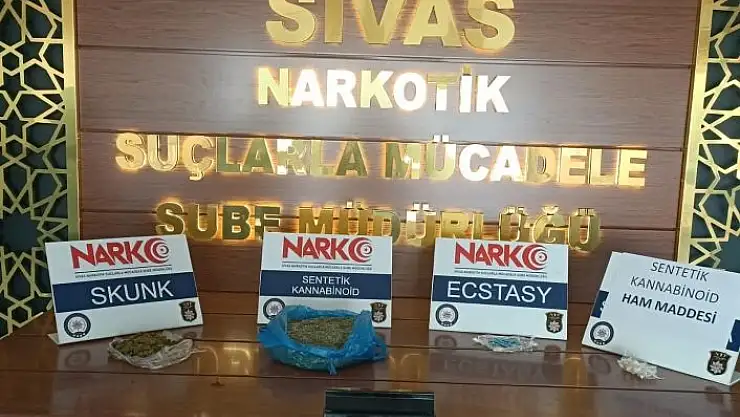 Sivas´ta polis ekipleri uyuşturucu madde satışına ve kullanımına yönelik çalışmalarını aralıksız sürdürüyor. Sivas´a il dışından uyuşturucu madde getireceği tespit edilen şahıs, polis ekipleri tarafından şehirlerarası otobüs terminalinde yakalandı. Şahsın, üstünde ve çantasında yapılan aramada 353.70 gr sentetik kannabinoid, 48.99 gr skunk, 20 adet extacy, 8.81 gr sentetik kannabinoid hammaddesi ele geçirildi.