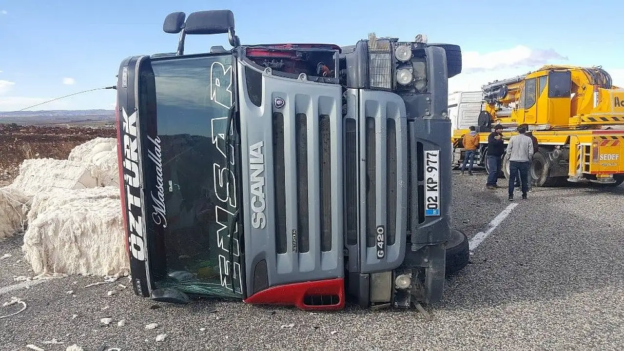 Adıyaman’da, sürücüsünün direksiyon hakimiyetini kaybettiği pamuk yüklü tırın devrilmesi sonucu 1 kişi yaralandı.