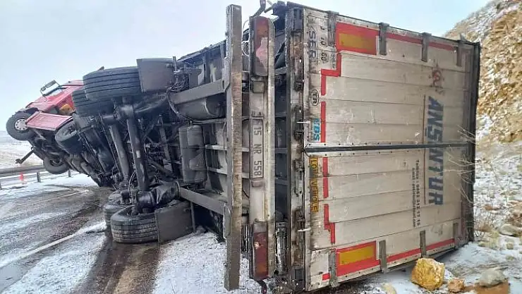 Sivas´ın Gürün ilçesinde kar nedeniyle kayganlaşan yolda kayan tır yan yattı. Kimsenin yaralanmadığı kazada polis memurunun üşümesin diye