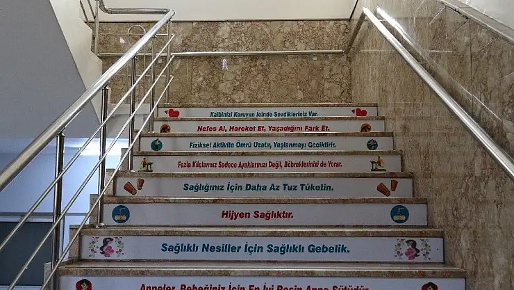 Merdivenlere yapıştırılan yazılarda fiziksel aktivite, sağlıklı ve dengeli beslenme, obezite, akılcı ilaç kullanımı, madde bağımlılığı, kanser taramaları, anne sütünün önemi gibi konular yer alıyor.