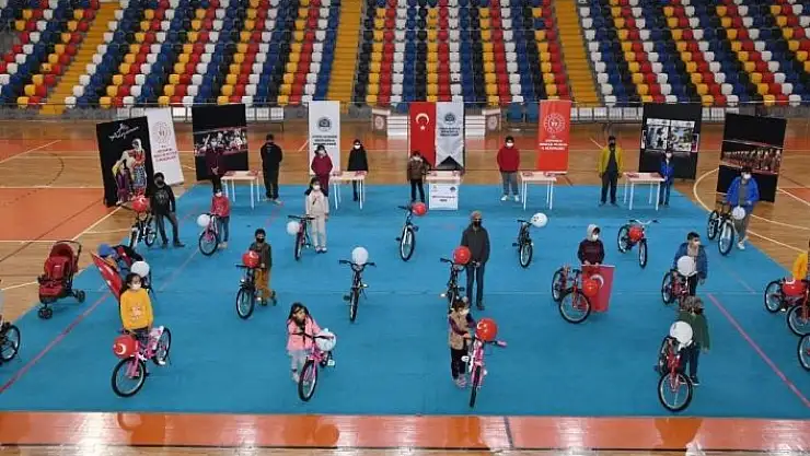 Konuşmaların ardından Vali Mahmut Çuhadar ve Sevgiyle Kucaklayan Yardımlaşma ve Dayanışma Derneği Başkanı Zeliha Özkaynak "Sevgiyle Kucaklaşalım" projesi kapsamında ihtiyaç sahibi 20 öğrenciye bisiklet ve 10 öğrenciye tablet dağıtımı yaptı.