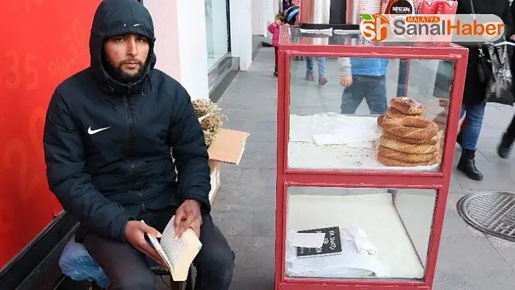 Kahramanmaraş’ta 7. sınıftan terk Tolga Adıgüzel, 17 yaşından beri simit sattığı tezgahın başında kitap okuyor.