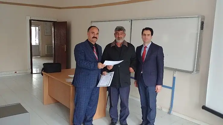 Belge dağıtım programına gelenlerin belgeleri İlçe Milli Eğitim Müdürü Ahmet Aydın, Halk Eğitimi Merkezi Müdürü Hüseyin Meriç ve Halk Eğitimi Merkezi Müdür Yardımcısı Yasin Yılmaz tarafından takdim edildi.