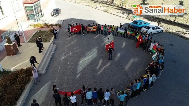 Sivas’ta bulunan Uluslararası Şehit Münir Murat Ertekin Anadolu İmam Hatip Lisesinde 45 farklı ülkeden 80 öğrenci eğitim görüyor. Ülkelerinden uzakta eğitim gören ve zamanlarının çoğunu okulda geçiren öğrenciler, her sabah güne Türk Silahlı Kuvvetleri tarafından Suriye’de yürütülen Barış Pınarı Harekatı’nda görev alan Mehmetçikler için dua ederek başlıyor. Mehmetçiğe dua eden öğrenciler, bugün harekata destek vermek amacıyla okul bahçesinde toplanarak Komando Marşı’nı okudu. Hilal şeklini alan öğrenciler, marşı okudukları esnada kendi ülke bayraklarını ve Türk bayrakları açtılar. Havadan da görüntülenen öğrenciler, Türk ordusunun Barış Pınarı Harekatı’nda muzaffer olacağını belirterek, Mehmetçiğe desteklerinin tam olduğunu söylediler.