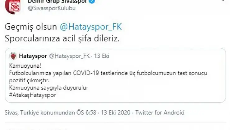 DG Sivasspor Kulübü, korona virüs testinde 3 oyuncusu pozitif çıkan Hatayspor´a geçmiş olsun mesajı yayımladı.