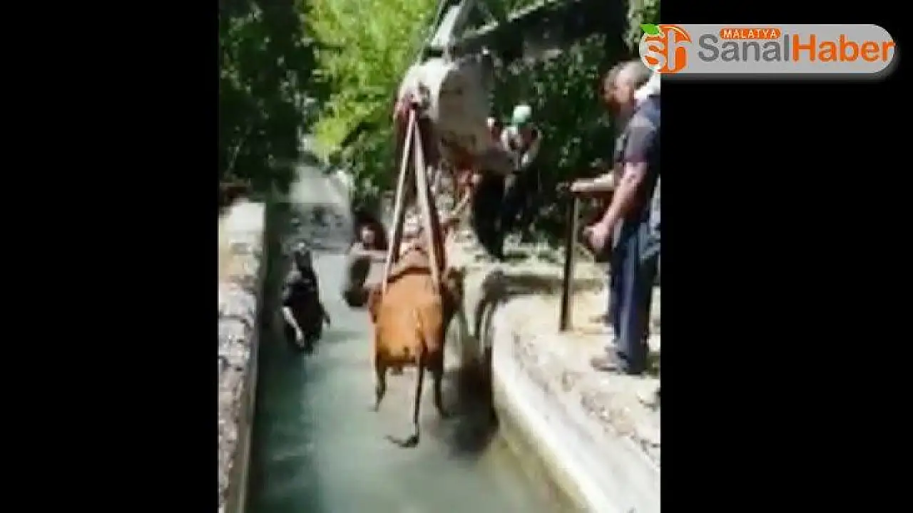 Malatya’nın Darende ilçesinde sulama kanalına düşen bir inek, itfaiyenin çalışması ile kurtarıldı.
