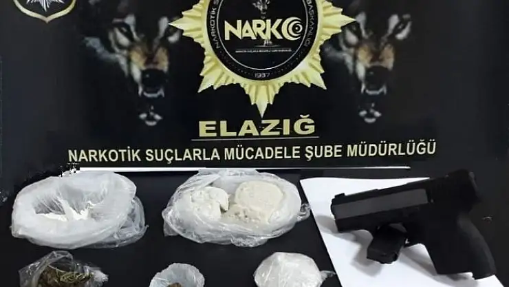 Elazığ´da polisin uyuşturucuyla mücadele kapsamında yaptığı çalışmada 1 şüpheli gözaltına alındı, çantasından ise kokain, hap ve esrarla birlikte tabanca çıktı.