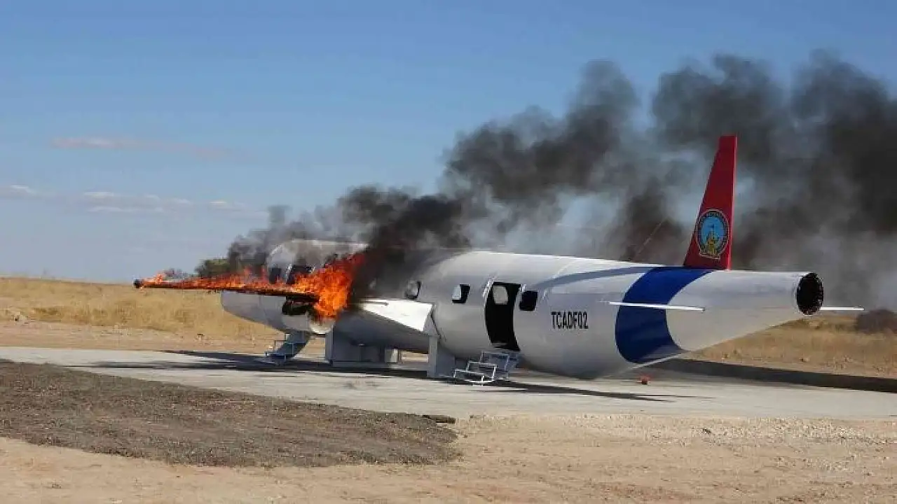 Adıyaman Havalimanında tatbikat için yakılan dev uçak maketinden yükselen alev ve dumanı gören vatandaşlar, gerçek uçağın düştüğünü zannetti.