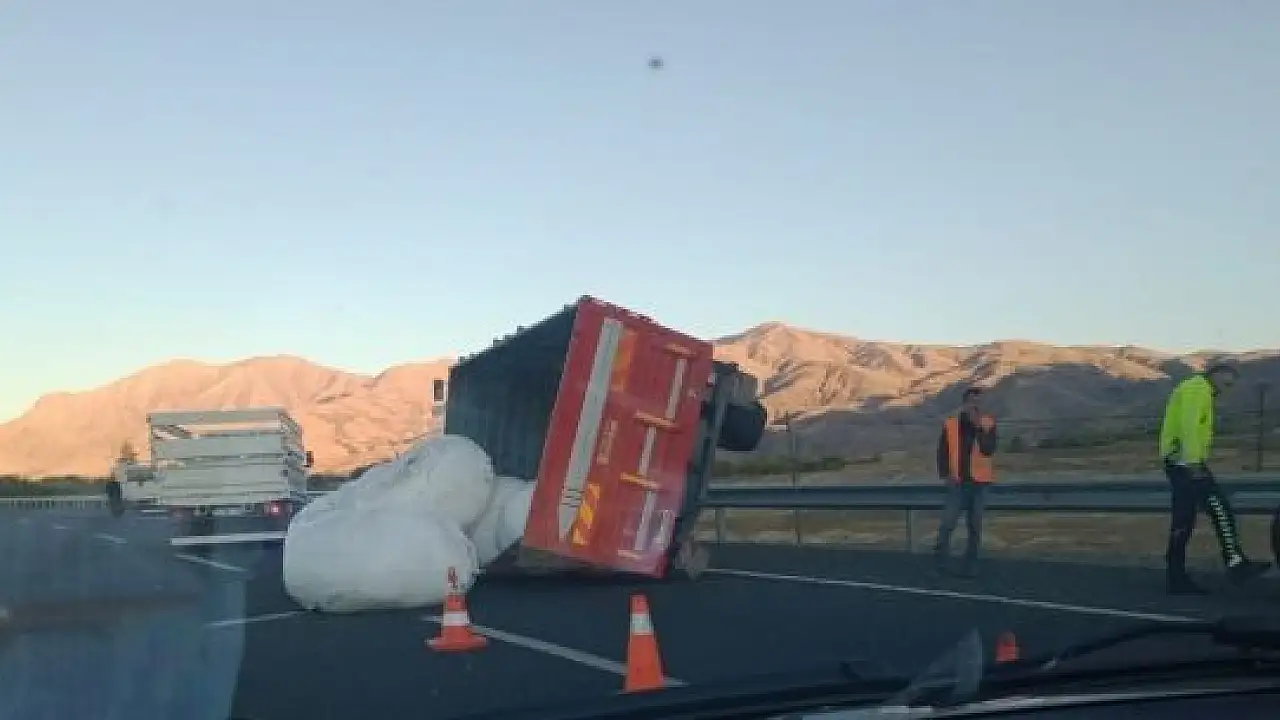 Olay, Elazığ-Bingöl karayolu 23´üncü kilometrede meydana geldi. Edinilen bilgiye göre, plakası ve sürücüsü belirlenemeyen küspe yüklü traktör, seyir halindeyken römorkunun arka sol tekerinin yerinden çıkması üzerine yan yattı. Traktörün römorkunda yüklü olan küspeler ise yol kenarına devrildi.