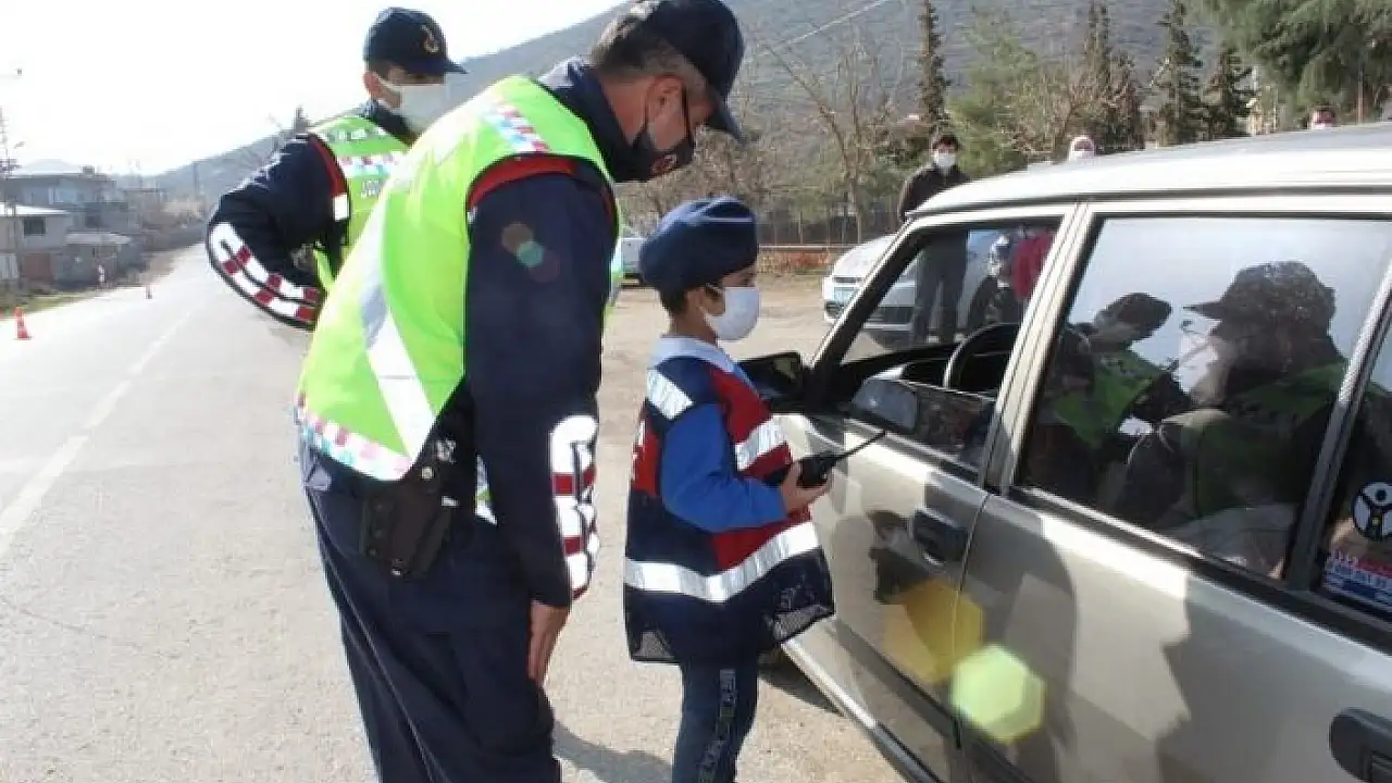 Eğitim sonunda öğrencilere bilgilendirici el broşürleri dağıtan jandarma çocuklarla birlikte araç denetimine katıldı. Jandarma kıyafeti giyen çocuklar ellerindeki telsizlerle beraber sürücüleri durdurarak ehliyet ve ruhsat sorgusu yaptı.