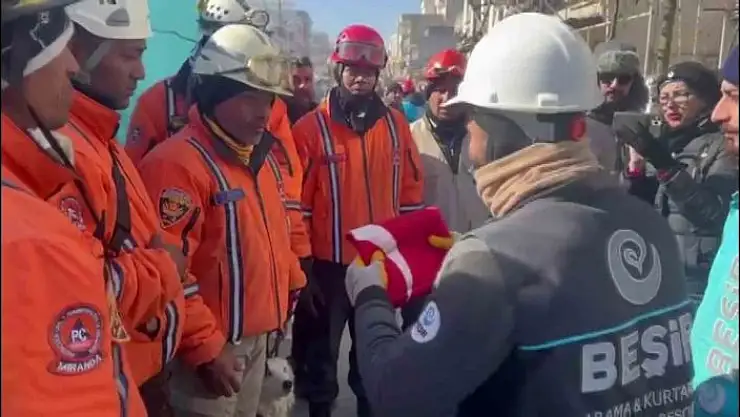 AFAD koordinasyonunda Saadet Apartmanı´ndaki kurtarma çalışmalarına destek veren Beşir Arama Kurtarma Ekibi, Venezüellalı arama kurtarma ekibi Miranda´ya, gösterdiği çabadan dolayı teşekkür ederek Türk bayrağı hediye etti. Türk bayrağını üç kere öperek Venezüellalı ekibe teslim eden Beşir Arama Kurtarma Ekibi´nin Miranda ekibine sarılması duygu dolu anlara sahne oldu.