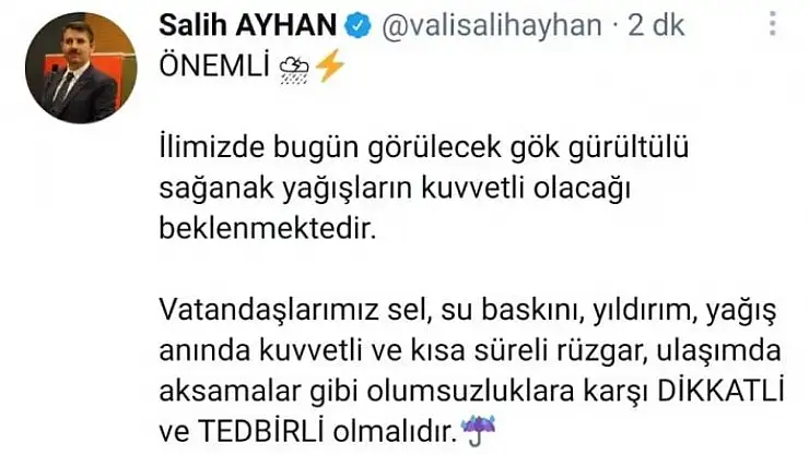 Sivas Valisi Salih Ayhan, kentte beklenen sağanak yağmur öncesi vatandaşları sosyal medya hesabından uyararak dikkatli olunması gerektiğini söyledi.
