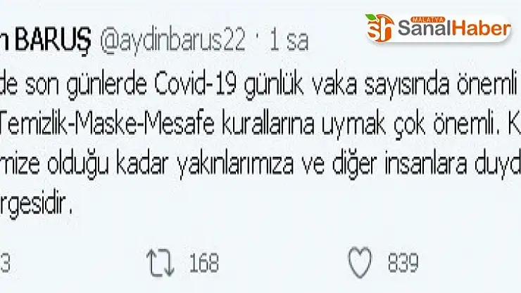 Vali Aydın Baruş, sosyal medya hesabında yaptığı açıklamada, “ İlimizde son günlerde Covid-19 günlük vaka sayısında önemli oranlarda artış var. Temizlik-Maske-Mesafe kurallarına uymak çok önemli. Kurallara riayet kendimize olduğu kadar yakınlarımıza ve diğer insanlara duyduğumuz saygının göstergesidir” dedi.