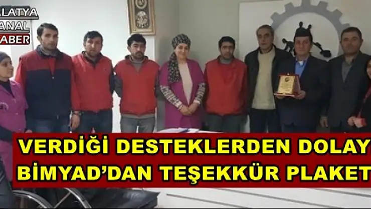 VERDİĞİ DESTEKLERDEN DOLAYI BİMYAD´DAN TEŞEKKÜR PLAKETİ