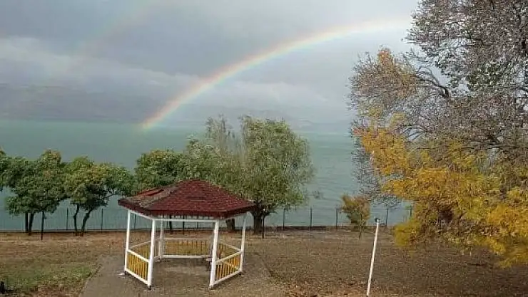 Elazığ´da yağmur yağışı sonrası havanın açılmasıyla birlikte Hazar Gölü´nde ortaya çıkan ikili gökkuşağı, seyrine doyumsuz bir manzara sundu.