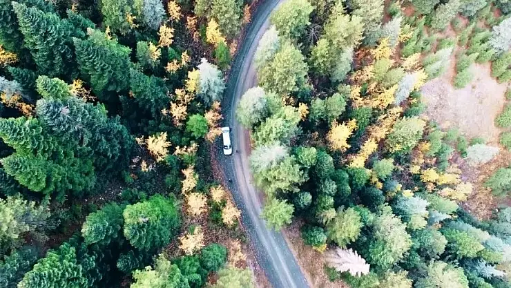 Değişik türde yabani bitki ve hayvanların bulunduğu sık ormanlık alan, sonbaharın sonunda havadan drone ile görüntülendi.