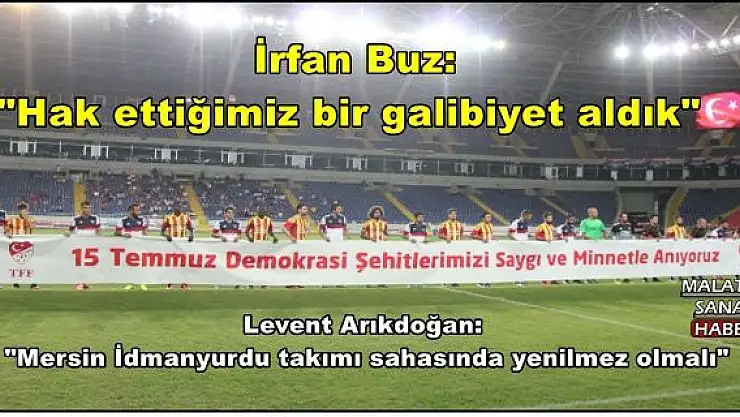 Yeni Malatyaspor Teknik Direktörü İrfan Buz, bugün her iki takım içinde önemli maç olduğunu vurgulayarak, "İlk maç zor olur. Zorlu günler geçiren bir rakibimiz vardı. Hazırlık döneminde sonra iyi sonuç almak istiyorduk. İlk maçımızı da kazandık. Hak ederek kazandık, gol pozisyonlarımız var. Konsantrasyon eksikliğinden gol yedik. Final paslarımız daha iyi olmalı. Önemli bir galibiyet aldığımızı düşünüyorum. Mersin İdmanyurdulu gençleri de kutluyorum. Ellerinden gelen mücadeleyi verdiler. Onlara da sezon içinde başarılar diliyorum" şeklinde konuştu.