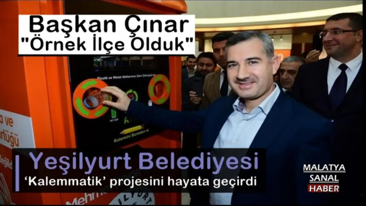 Gelecek nesillere yaşam standardı yüksek, sağlıklı ve güzel bir Yeşilyurt emanet etmek amacıyla çevresel projelere farklı bir önem verdiklerini ifade eden Yeşilyurt Belediye Başkanı Mehmet Çınar, “İnsan sağlığı ve doğanın korunması açısından farkındalık oluşturmak ve bilinçlendirme yapmak adına atık yağ, atık pil, bitkisel atıklar, elektronik ve ambalaj atıklarla ilgili 2014 yılından beri hayata geçirdiğimiz gerek yatırımlarımız gerekse de projelerle Yeşilyurt’umuzu bu anlamda örnek bir ilçe hüviyetine ulaştırdık. Yeniden dönüştürülebilen maddelerin tekrar hammadde olarak kullanılması büyük miktarda enerji tasarrufunu mümkün kılacaktır. Yeşilyurt Belediyesi olarak ta beş yıllık hizmet dönemimizde bütün alanlarda olduğu gibi çevre ve doğa sağlığının korunması noktasında kalıcı yatırımlarda bulunduk, sosyal sorumluluk projelerimizin sayısını artırdık. Doğa sağlığının korunması gibi hassas bir konuya dikkat çekmek ve farkındalık oluşturmak için ‘Kalemmatik’ projesini hayata geçirdik. İlk etapta merkezi yerlerde konumlandırmayı planladığımız iki farklı gözü bulunan makinemiz, bırakılacak plastik ve metal atıklardan sonra kalem hediye etmektedir. Üzerindeki güneş panelleri sayesinde kendi enerjisini üretme özelliğine sahip makinemiz, iç ve dış mekân çalışma özelliğiyle Türkiye’de ilk olma özelliği taşımaktadır. Vatandaşlarımız plastik ve metallerini çöpe atmadan bu makineye bırakıp, çevre ve doğanın korunması noktasındaki hizmetlerimize katkı sunabilirler. Bugüne kadar hayata geçirdiğimiz bütün sosyal sorumluluk projelerimize katkı ve destek sunan kıymetli hemşerilerimizin bu projemize sahip çıkacaklarına eminim. Projemiz hayırlı olsun” diye konuştu.