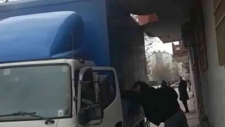 Elazığ´da bir sokaktan geçmeye çalışan kamyonet, sürücüsünün yüksekliği hesap edememesi nedeniyle balkon duvarına sıkıştı. Evde yaşayanlar deprem olduğunu sanarken, araç yaklaşık yarım saatlik uğraşın ardından çıkarıldı.