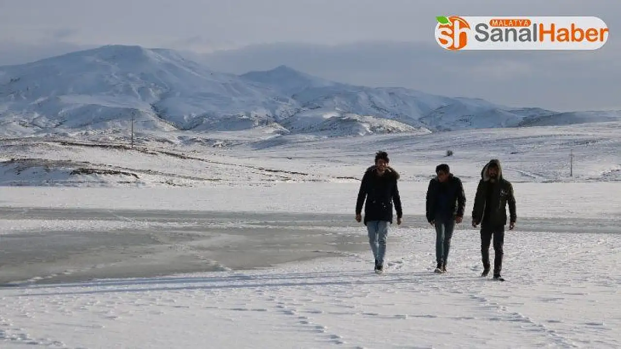 Sivas’ın Altınyayla ilçesinde bulunan Güzeloğlan baraj göletinin yüzeyi buzla kaplandı. Buru fırsat bilen vatandaşlar yaz aylarında yüzmeye korktukları göletin üzerinde yürüdüler.